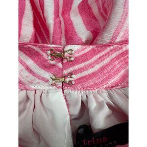 This Trina Turk halter dress embodies a playful charm with its pink and white striped pattern and flowing ruffle hem. The lightweight fabric offers comfort and grace, while the hook-and-eye closure ensures a secure fit. A versatile piece suited for warm days or evening outings, it radiates effortless elegance.