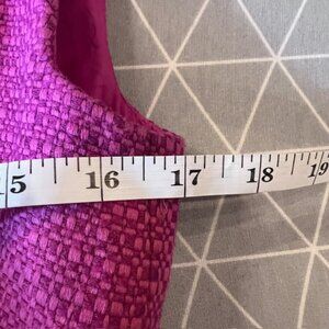 Step out in bold sophistication with this gorgeous Trina Turk sheath dress in a striking magenta pink hue. Designed with a chic textured woven fabric, this dress features a sleeveless silhouette, notched neckline with keyhole cutout, and a belted waist with gold-tone hardware detail for a flattering finish. Fully lined with lace hem trim for extra comfort and structure. Perfect for weddings, cocktail parties, special events, or polished workwear.