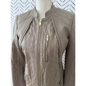 The Trina Turk Women's Quilted Leather Moto Jacket in size 2 is a stylish and versatile outerwear piece designed for women. Made of high-quality leather with a solid pattern and quilted accents, this short jacket features long sleeves and a zip closure for added convenience. Perfect for various occasions such as travel, parties, or casual outings, this jacket exudes a chic and fashionable vibe with its motorcycle jacket style and designer brand. The beige color, along with the leather lining and insulation material, adds a touch of luxury to this edgy and trendy piece.