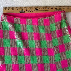 The Trina Turk Rico Sequin Mini Skirt in size 4 is a stylish and eye-catching piece perfect for any party or cocktail occasion. This short, multicolor sequin skirt features a checkered pattern and a zip closure for easy wear. Made from polyester and designed with a lining, this skirt is sure to make a statement and is a trendy addition to any woman's wardrobe. Made in the United States, this skirt is ideal for summer, fall, and spring events, adding a touch of glamour to any outfit.