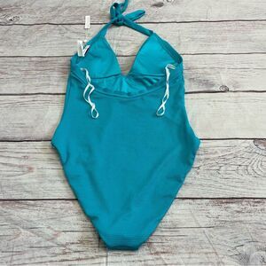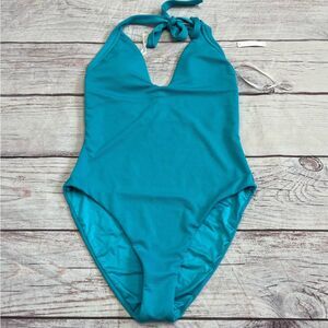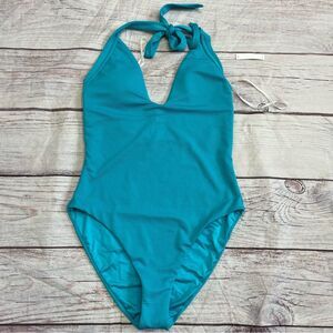 Trina Turk Women’s Ripple Rib Halter Plunge One Piece Swimsuit Blue Size 12 NEW