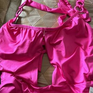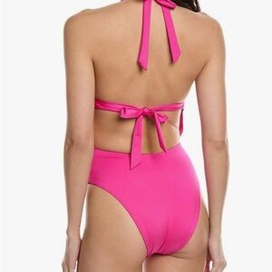 Step out in style with the Trina Turk Monaco Halter One Piece Swimsuit. Flaunting a stunning rose pink hue and a flattering halter neckline, this swimwear piece is designed to make a statement. Crafted from a comfortable blend of nylon and spandex, it promises the perfect amount of stretch for all-day wear. With a sleek silhouette and playful cut-out detailing, this swimsuit is your must-have for any beach getaway or pool lounge session.