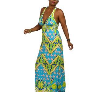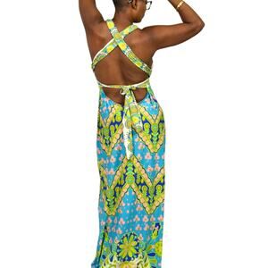 Trina Turk Woodblock maxi dress FEATURES halter neckline with plunging v in front and a low back. Removable bust padding. Fabric ties that criss cross and tie in back. Long length. A-line silhouette. Whether you're enjoying brunch or lounging by the pool, this dress effortlessly transitions from day to night.