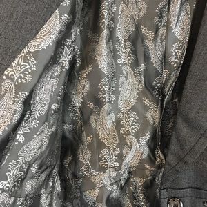 Just gorgeous describes this blazer by Trina Turk. This blazer features a blend of 85% wool and 15% silk for a fabric with a beautiful hand and slight sheen. It is fully lined in complementary fabric with fabric covered buttons on the cuffs and a snap closure bow on front. In excellent condition, 24.5" sleeve length, 22.5" length, 21.5 across bust from underarm to underarm when buttoned, clean, pressed and from a smoke free home.