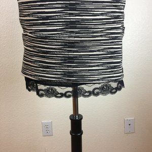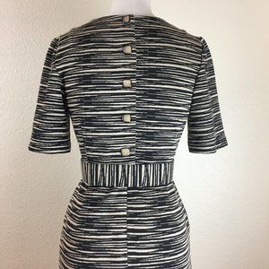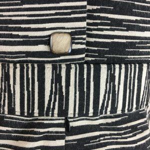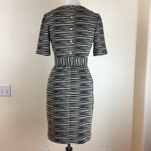African inspired horizontal striped dress with vertical striped belt, side pockets, polished wood buttons, and very sexy hidden lace bottom lining. It has short sleeves and could handle a jacket over it very nicely. This dress is in excellent condition and is a knock-out!!!