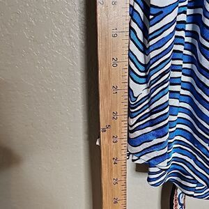 Trina Turk XS Silk Blend Strapless Romper Blue and White Striped with tie belt in excellent condition. Stylish shorts romper with blue and white stripes. Features a decorative bandeau neckline, pockets and tie waist. Perfect for casual outings.