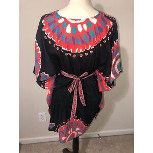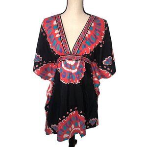 Trina Turk Yucateca Tunic Swim Cover Dress Size S Black Red Multi Short Caftan