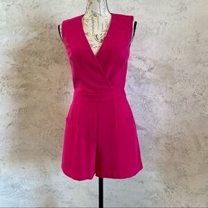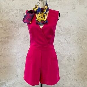 Trina Turk Zoria Romper in a Vivid Pink 100% poly fabric, Back zipper closure, front pockets, and Front patch pockets. Fully Lined. Size 0. Gently worn and in great condition. *Beautiful Trina Turk 36x36 scarf with pouch included.