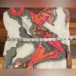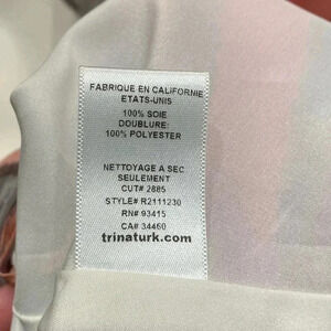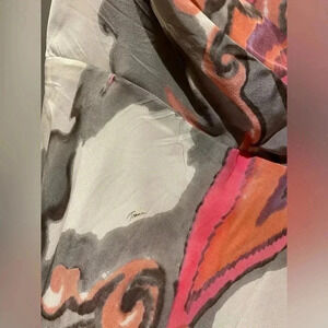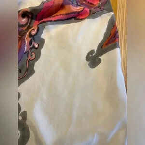 Flattering bias cut. Very pretty pink and gray print on white fabric with gray trim.