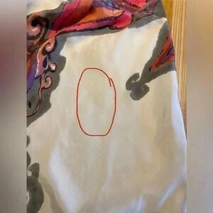 Overall very good condition, worn once or twice. There is a light yellow spot on the front that you can see if you know where to look. I posted the same photo twice, once with it circled.