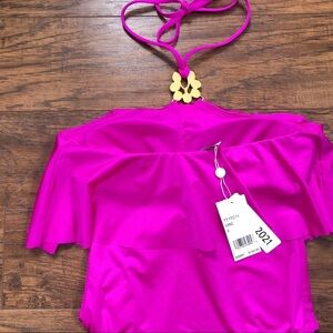 Fabulous onepiece swimsuit by Trina Turk from their summer 2021 collection. “Bijou Solid Flutter High Neck” style in “orchid purple” (more of a vibrant magenta / fuchsia pink IMO). Tie halter neck style with yellow jewel detail, ruffle flounce over bust, and molded cups for support. Size 2, brand new with tags & hygienic liner intact.