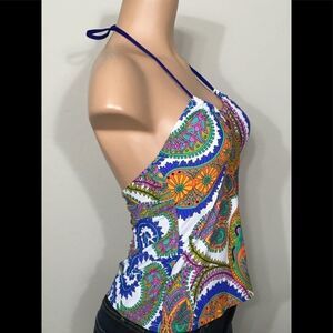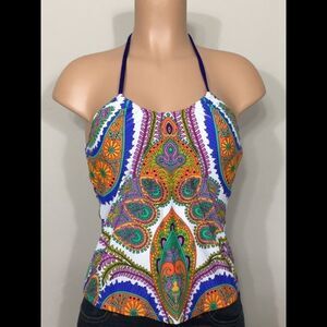 Beautiful floral paisley print. I love the colors on this. Blue, white, purple, orange, green, and gold. Gold hardware on the straps.