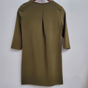 Trina Turk olive green half zip 3/4 sleeve dress size 2. this dress is perfect for many occasions. see scientology last photo of the circled area. there is a slight dark mark there. it's hard to see but worth noting. it might be able to be washed out.