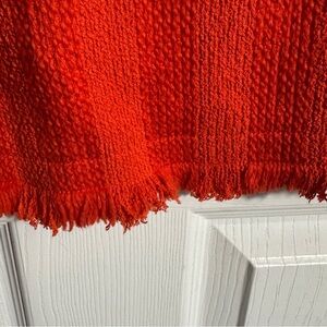Trina Turk top in a vibrant orange color with subtle tone on tone striping. Size Medium. 3/4 sleeve, with fringed edge (hem also has fringed edge). Nubby woven fabric made of 96% cotton, 4% polyester. Side slits. Square neck in front, V neck in back. Super cute and great for spring and summer!