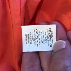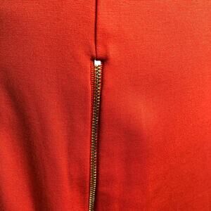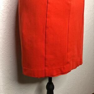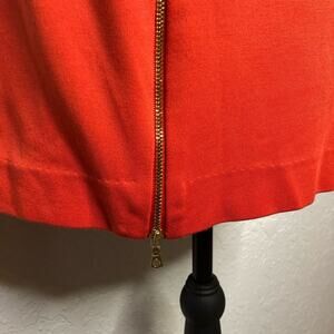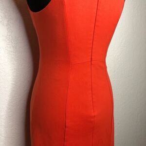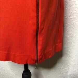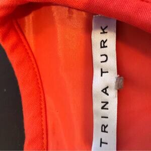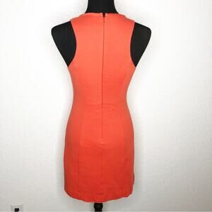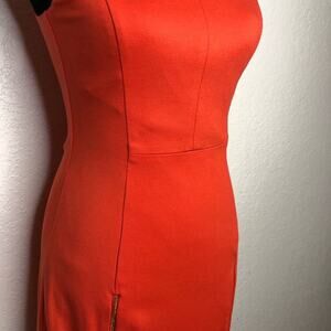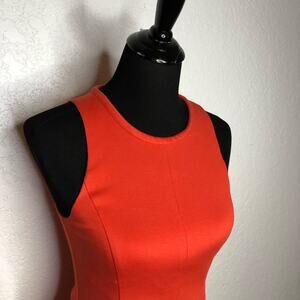 Trina Turk orange zipper hem sleeveless sheath dress. Round neckline. Sleeveless. Double zipper front hemline. Zips in back. Fully lined. Size tag has been removed but best fits size Extra Small XS. Excellent preowned condition. Minor wash wear.