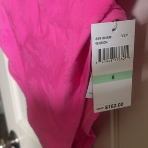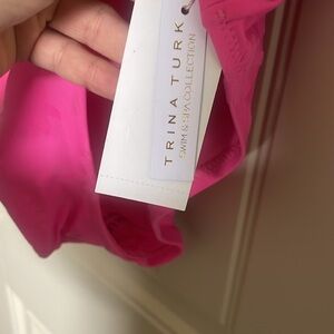 This vibrant pink one-piece swimsuit features charming ruffles, perfect for a fun day at the beach or pool with gorgeous palm tree designs