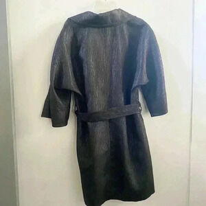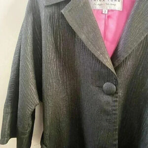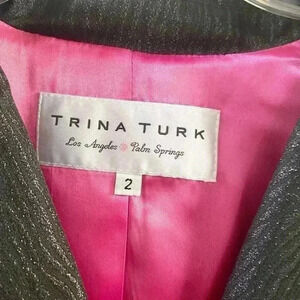 Trina Turk black shimmer trench coat. Has a belt and three quarter sleeves. Beautiful bright pink lining. Size 2. Excellent used condition