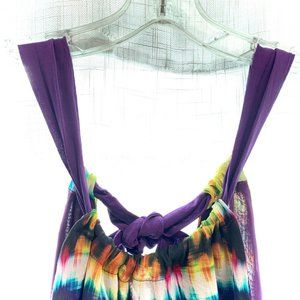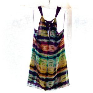 Breezy, sophisticated mini dress. Trina Turk “Rancho Stripe”. Tie-dye/ikat look with fully adjustable purple straps that tie in back so you control how low or high you'd like the armholes and neckline to be. Vibrant pattern composed of yellows, greens, aqua, turquoise, purples, fuchsia, orange, black, white. Flat measurements: Length (neckline to hem; straps not included) 30.5". Pit-pit 19.5". Lining in back has a 3.5" portion where stitching is not coming apart but is a bit stressed. Back keyhole needs some reinforcing. Photos point out these small flaws as well as any minor fraying I found on the piece. Eye-catching with pretty sandals or flirty heels at bridal showers, brunch, graduation.