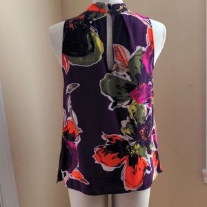 Trina Turk silk mockneck Tank bold floral purple Mod pleated neck detail S
