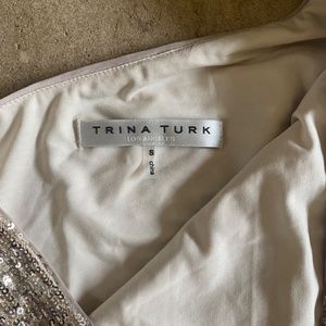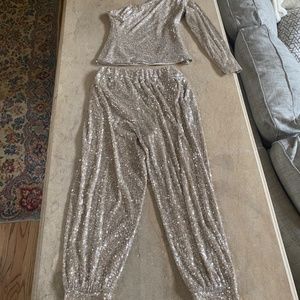 Never worn- size small top and medium bottom champagne colored sequin outfit- so cute and so perfect for New Year’s Eve- I purchased this for a show that was canceled and never wore it, lost weight and now it doesn’t fit. Purchased directly from the Trina Turk website