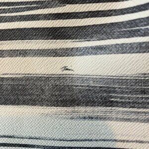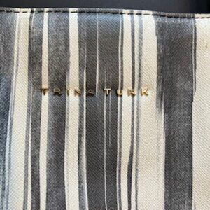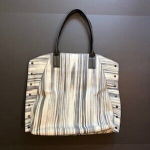 This Trina Turk Tote sports a faded/ erratic stripe like design in muted shades of black and gray on white.. Darker black handle and rivets. Inside has side zippered pouch and 2 open pouches for easy access to keys, sunglasses or cell phone. Nice size at 15" x 16". Clean inside, great shape on both sides, however there are signs of wear on bottom corners (see pics).