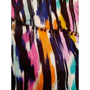 Style: Colorful, boho, one shoulder top. Ruffle and tiny pom pom fringe detail at neckline. 100% rayon. Perfect for spring, summer and festival season!