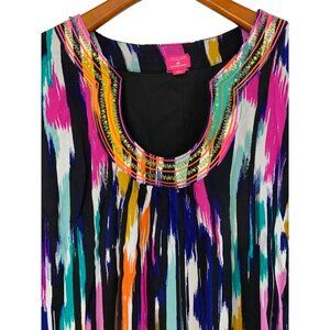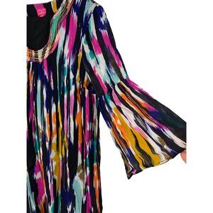 Bohemian-inspired dress with eye-catching multicolor prints and an embellished sequin neckline. Ideal for casual outings or semi-formal events.