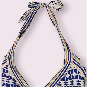 One piece halter top tie swimsuit in a fresh colorful geometric print of royal blue on white with splashes of turquoise, grey and orange, trimmed at the bust, back and leg openings in a coordinated contrasting stripe of the same colors. Fully lined, shelf bra, deep V both front and back. Excellent lightly used condition, no stains or fading.