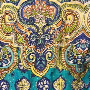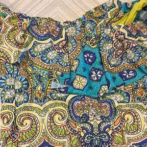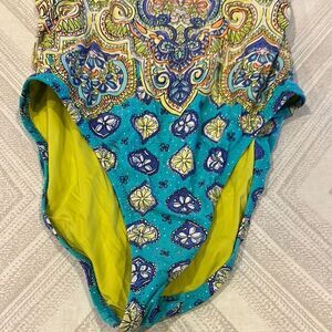 4. Vibrant one-shoulder swimsuit with a paisley pattern. Features blue, yellow, and green colors. Gently worn.