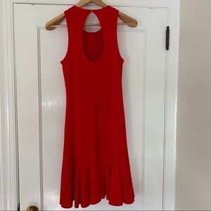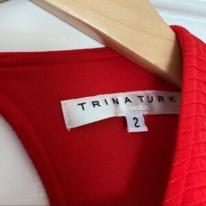 Trina Turk ruffled A-line dress. Beautiful vibrant red. Worn once for a few hours. No signs of wear. Ribbed knit dress with back keyhole accent Roundneck Sleeveless Back keyhole with hook-and-eye closure Pullover style About 42" from shoulder to hem Polyester/viscose Dry clean Made in USA.