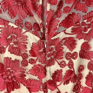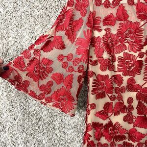 Excellent used Condition Women’s Trina Turk Red and Beige Nude Floral Embroidered Bell Sleeve Sheath Cocktail Dress in Size 2