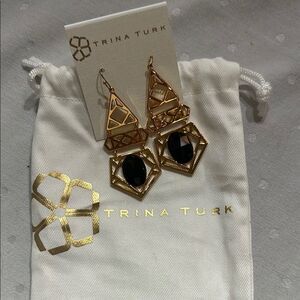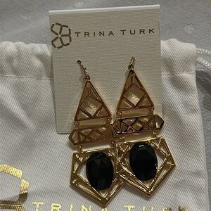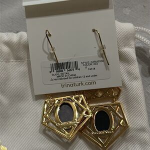 New! Elegant geometric art deco earrings by Trina Turk. Features gold and black design. Perfect for any occasion.