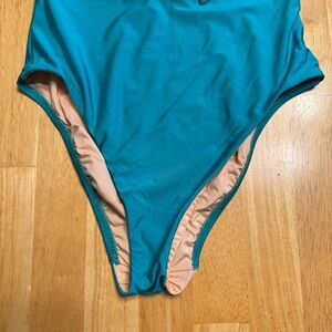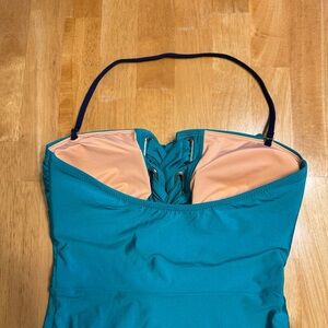 Trina Turk One Piece Swimsuit Size 6. This is a sample swimsuit that was taken to retailers. It’s in nice condition. The color is turquoise. Please see last picture.