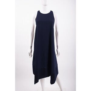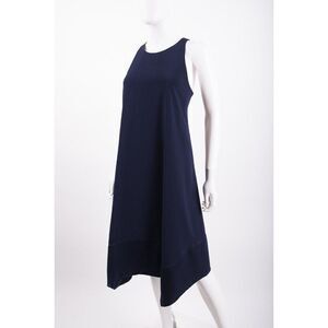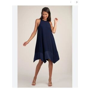 High necklineRacerbackA-line silhouette with handkerchief hemWide blocked indigo fabric along hemBack zipperruns true to size