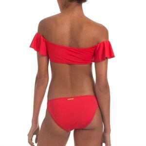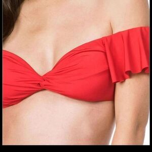 Removable halter strap. Beautiful off the shoulder ruffle detail.