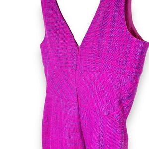 This is a great TRINA TURK Dress. It has a stunning tweed pink & blue/purple material, rear zip closure, is lined and pleated details. Plunging V neckline in front and back. Perfect for the office. Hits above the knee.