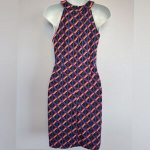 Beautiful print dress with zippered back and halter style neckline. Some stretch to it, but it fits small.