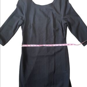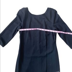 Trina Turk Black Mini Dress. Features 3 1/4 sleeves, modest scoop next, plunging back. Pull on styling. Gorgeous, simple, stylish.