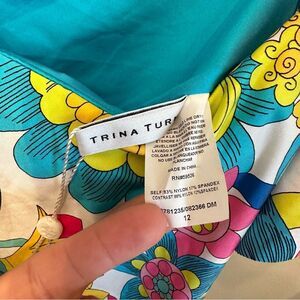 Size 12. Trina Turk Fontaine new with tags off the shoulder ruffle floral swimsuit. Dive into elegance with Trina Turk's vibrant one-piece swimsuit, showcasing a stunning red and pink design. Crafted for both style and comfort, this swimwear is perfect for making a splash at any poolside gathering.