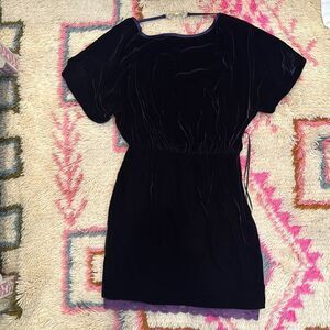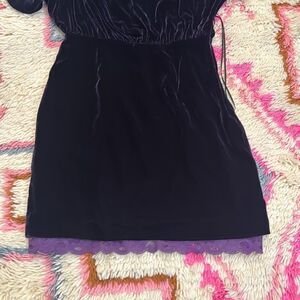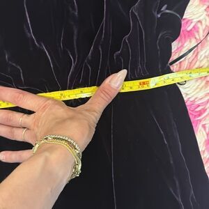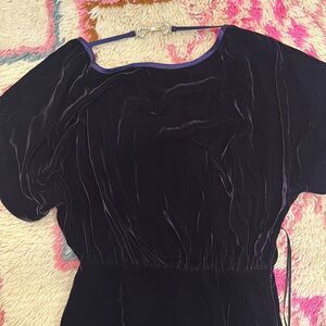 Features: dark purple velvet, dolman/batwing short sleeves, blouson bodice, dipped back, side zipper closure, small rhinestone bow that can be worn in front or back