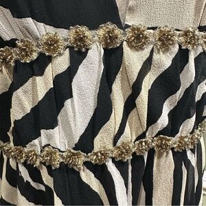 Cue the Y2K nostalgia! This stunning Trina Turk dress is a near-exact match to the iconic zebra print dress worn by Ashley Tisdale in the early 2000s alongside Zac Efron. Crafted from 100% silk, this piece features a bold black and cream zebra print with intricate gold beaded trim at the empire waist and underbust, a flattering deep V neckline front and back, and a floaty handkerchief hem.