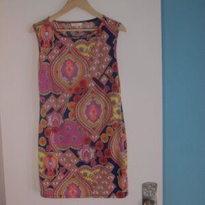 Orange Pink Yellow Blue Vibrant colorful print dress. Poly spandex stretch, pullover.