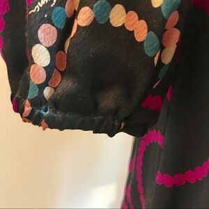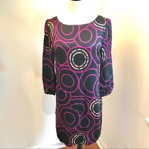 Trina Turk long sleeve dress with a circle design. Elastic cuffs, fully lined and round neck. Bust 38”, sleeve 19”, length 38” and waist 38”.