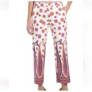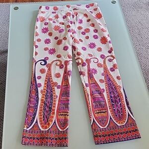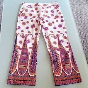 These gorgeous pants are fully lined, 99%cotton, and 1% spandex. They have a 9" rise and a 27" inseam, so they could be worn as an ankle cropped or regular length depending on your height. Beautiful colors. B29.1221