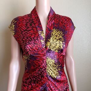 EUC women's silk blend cap sleeve dress, moderate stretch with a smooth silky feel, back hidden zipper that doesn't go all the to the top. Fitted and just below the knee.