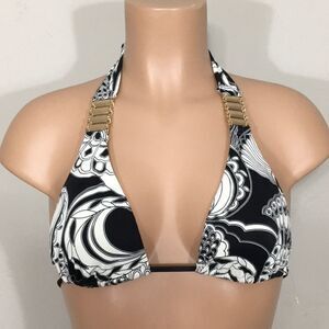 Trina Turk geometric string triangle bikini top with gold embellishment on straps. Black and white. This is a sample style. No tags but it’s new.