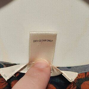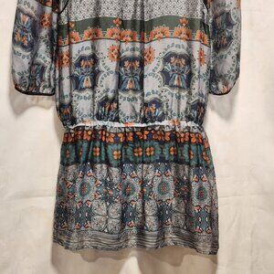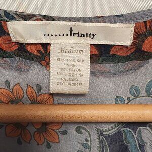 Women's size M, Trinity, multicolored floral blouse. Gathered elastic waist, V-neck three button closure, and a ruffled neckline. 100% silk and 100% rayon lining, made in China, dry clean only.