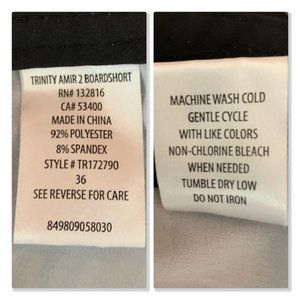 Trinity Amir 2 boardshorts. Navy, teal & gray stripes & patterns. 1 Velcro flap cargo pocket. Velcro & tie close. In excellent condition.