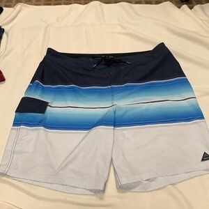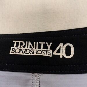 Trinity Boardshorts 40 in Blues and Gray Stripes. One side Velcro pocket. Velcro and tie closure. In very good condition. Measurements are laying flat-