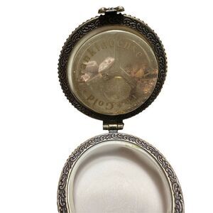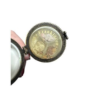 Nativity Trinket/pill box by Trinity Boradcasting Company. Features Mary Joseph and Jesus scene on top. When you open there are compartments with Frankincense, Myrrh, and “Gold”.